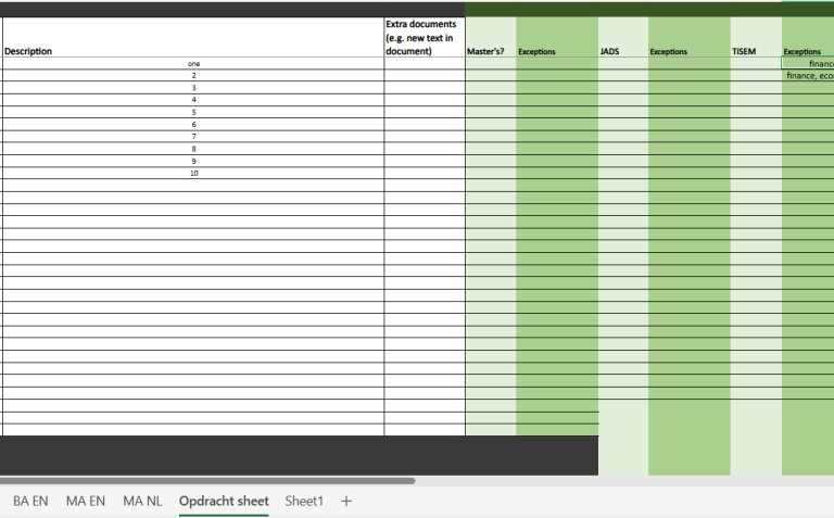 Verder heb ik voor Tilburg University een overzichtsstructuur gemaakt in Excel. Deze is gemaakt voor specifieke aanpassingen die gedaan moeten worden op één of meerdere webpagina's op de website van Tilburg University. Sinds deze website erg groot is, zorgt zo'n overzicht voor een overzichtelijkere communicatie tussen de mensen die aanpassingen willen en de mensen die deze aanpassingen moeten doorvoeren.